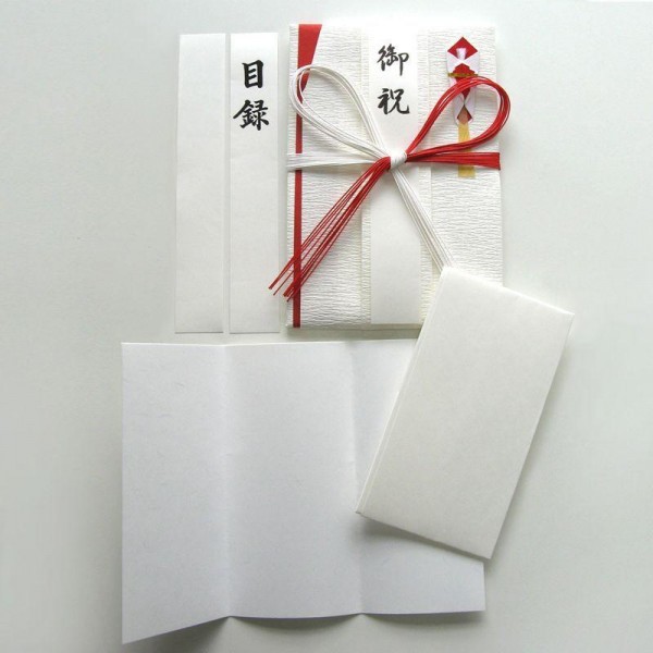 | セット内容 | ・金封 ・目録用中紙3枚(A4サイズ・三つ折りにして使用します) ・金封用中袋1枚(多当折りタイプ・お札が100枚程度まで入ります) ・短冊3枚(御祝/目録/無地) |