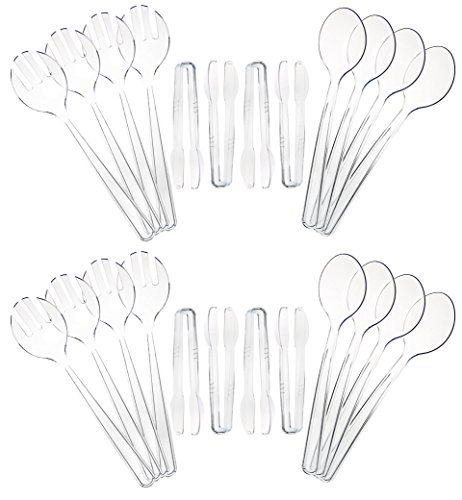 Set of 24 Heavy Duty Disposable Plastic Serving Utensils! Four 10” Spoons and Forks, Four 6-1/2” Tongs! Clear Serving Sets Perfect for Parties, Events, BBQ's and More!