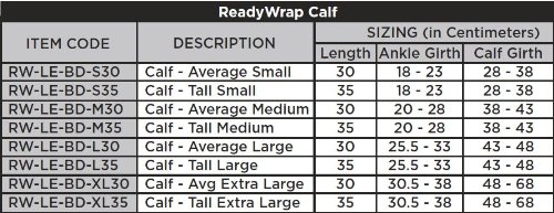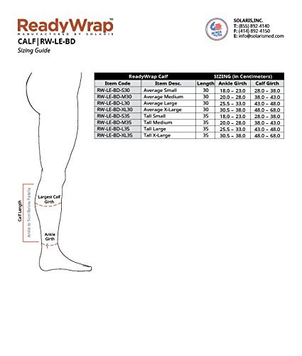 -. Brand : ReadyWrap -. Color : Black -. Feature : Indications: Lymphedema / Other forms of edema / Venous issues, such as varicose veins and venous insufficiency -. Label : Solaris -. Manufacturer : Solaris -. MPN : RW-LE-EG -. PartNumber : RW-LE-EG -. ProductGroup : Health and Beauty -. ProductTypeName : PERSONAL_CARE_APPLIANCE -. Publisher : Solaris -. Studio : Solaris -. Title : Solaris Ready Wrap Compression Calf Wrap, ReadyWrap