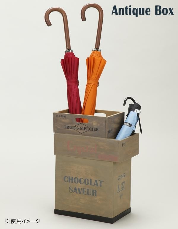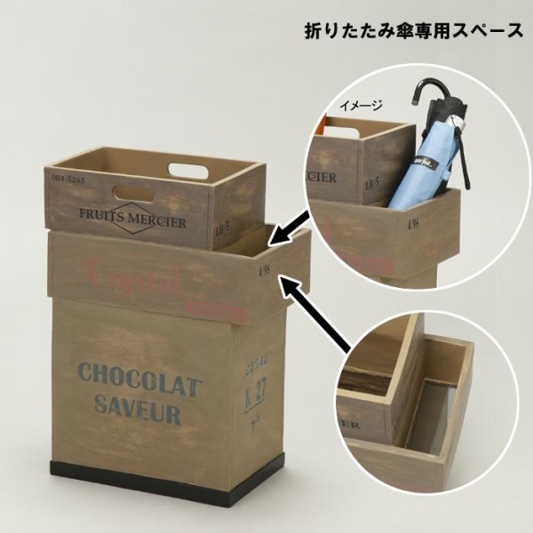 アンティークの木箱をモチーフにしたJUNKなシリーズの傘立てです。折りたたみ傘専用のスペースもあります。