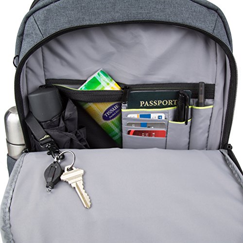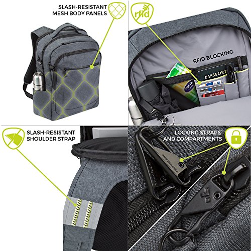 Studio : Travelon Publisher : Travelon Binding : Apparel Product Description The travelon anti-theft urban(r) backpack makes an exceptional commuter and travel bag. It features clean, modern design with thoughtful organization. The roomy main compartment features a padded and fleece lined compartment for your iPad(r) or tablet. A separate front zippered compartment features rfid blocking card and passport slots, a zippered wall pocket, a pen loop, and a tethered key clip with led light so you can stay organized. There's a padded fleece lined compartment for your laptop to 15.6". The exterior has front zippered pocket and mesh expansion pocket for a water bottle. The air mesh back panel and straps are comfortable to wear. The top grab handle with neoprene is comfortable too. Slide the backpack over the handle of your wheeled carry-on with the add-a-bag strap to move effortlessly. Patent: http://www.travelonbags.com/patent-marking 0