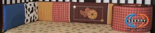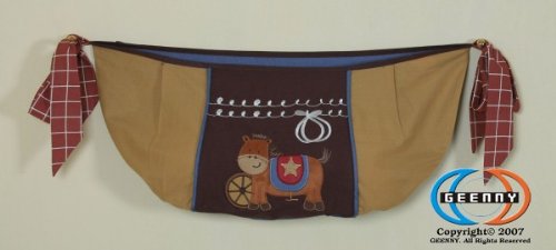 -. Feature : Additional matching accessories such as, Musical Mobile, Lamp Shade and Extra Window Valance available on Amazon.com / Crib, Mobile, Lamp Shade and Border are not included / Machine Washable / Material: Cotton, Polyester / 13 piece set includes: one comforter, one bumper, one fitted sheet, one skirt, two window valances, one diaper stacker, one toy bag and two throw pillows, three wall art decor hangings / Horse cowboy animal theme / Sew-on pattern, not P.R.Int pattern / Additional matching accessories such as, musical mobile, lamp shade and extra window valance available