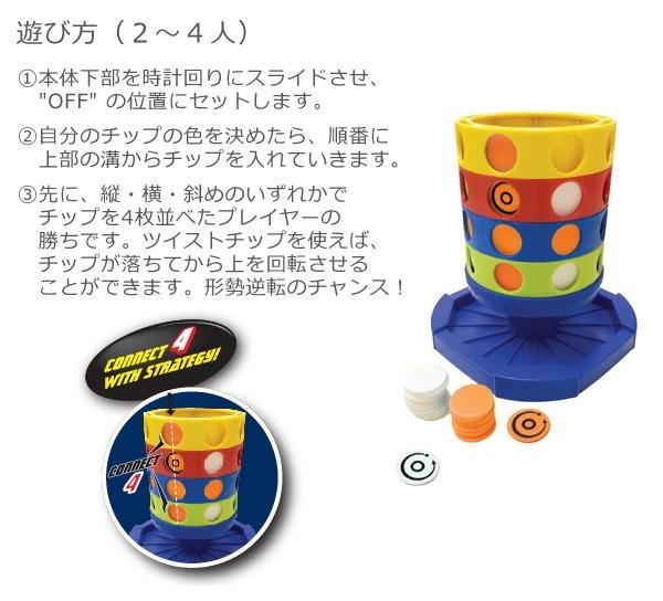 2~4人で遊べるシンプルでアナログなゲームです。順番に上からチップを入れていき、先に縦・横・斜めのいずれかでチップを4枚並べた人の勝ちです。単純だからこそついつい熱中して何度もやってしまいます! |