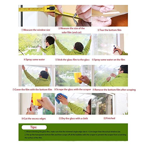 Features 1. 15% VLT can effectively reduce glare, widely used in home, office, dining room, kitchen, bedroom, etc. 2. 90% Infrared blocking 85% Anti-UV, reduce time of using air conditioner, low-carbon and energy conservation, meanwhile protect your interior. 3. No glue, made from environmentally friendly PVC, 0.15mm thick, clean and bright, no hidden trouble. 4. Easy to install, static cling, applicable to any smooth or flat glass surface, like window, sliding door, balcony, protecting your window glass. 5. The self adhesive window privacy film can last long, also can remove as you need. It comes off cleanly without leaving residue. Installing Steps