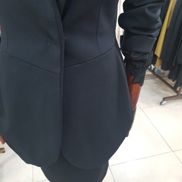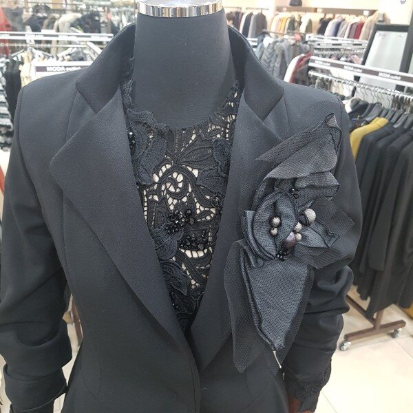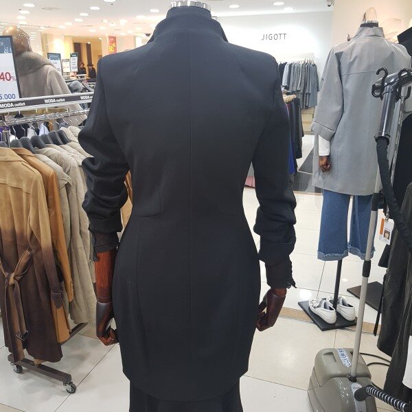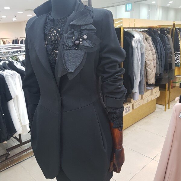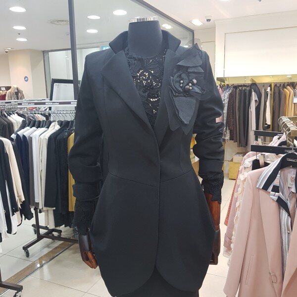 코사지장식이 포인트인 슬림핏 자켓 디자인입니다.