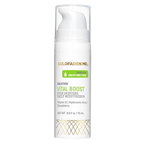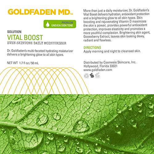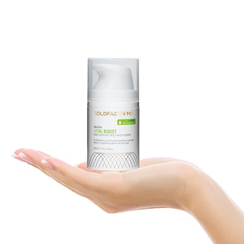 More than just a daily moisturizer, Dr. Goldfaden's Vital Boost delivers hydration, antioxidant benefits and a brightening glow due to the potent botanical extracts known for their balancing and anti aging properties, including Organic Red Tea Extract, Gooseberry Extract and Oil of Grapefruit. This moisturizer may improve elasticity and promote a more youthful complexion while brightening skin agent, Gooseberry Extract, leaves skin looking dewy, radiant and flawless. Skin-boosting and rejuvenating Vitamin D enhances skin, providing powerful hydrating properties. This formula also contains line-filling Hyaluronic Acid to deliver long-lasting hydration and is suited for men and women with all skin types including sensitive, problem prone, dry, oily, combination and mature. To use, apply on cleansed skin to face, neck and decollete with gentle upward motions. For optimal results, use daily. Caution: If irritation occurs, please discontinue use. For external use only. Ingredients: Water, Simmondsia Chinensis (Jojoba) Seed Oil, Cetyl Alcohol, Candelilla/Jojoba/Rice Bran Polyglyceryl 3 Esters, Glyceryl Stearate, Glycerin, Sodium Hyaluronate, Squalane, Magnesium Aluminum Silicate, Sodium Stearoyl Lactylate, Glyceryl Caprylate, Xanthan Gum, Cellulose Gum, Cetearyl Alcohol, Phenoxyethanol, Ethylhexylglycerin, Cholecalciferol (Vitamin D), Citrus Paradisi (Grapefruit) Peel Oil, Emblica Officinalis Fruit Extract. For external use only. We are fully committed to your happiness, love our Vital Boost or we will make it right. MADE IN THE USA