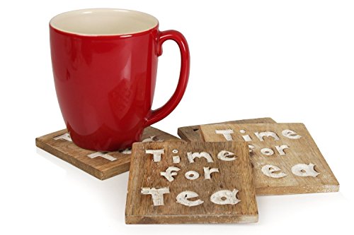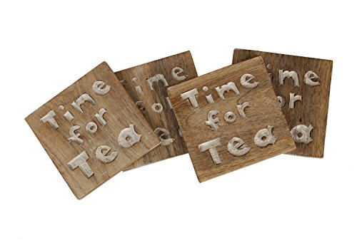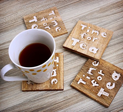 - Coasters for Drinks add a quirky appeal to your table settings with this set of 4 made with durable mango wood hand carved with a funky ‘Time for Tea' message on each coaster