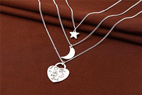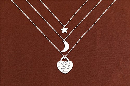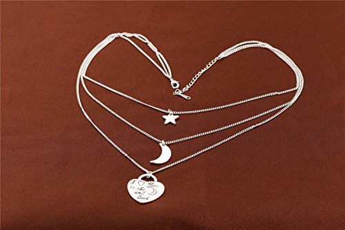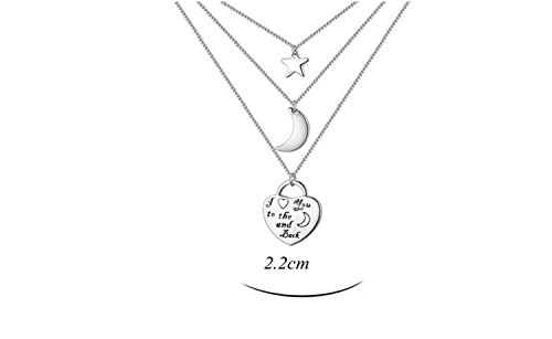 - Feature : 1. Specifications: 1.Chain Length: 18 inches + 2 inches. Pendant Height: 0.86 inches. Pendant Width: 0.86 inches. | 2.Weight:0.66 ounces. | 3. Pendant Shape: Heart, Star, Moon. Chain Type: Box. | 4.Metal Type: Eco-friendly White Gold Plated. | 5. Craftsmanship: Triple-layer vacuum furnace plating. / 2. Please make sure that you buy from "NEEMODA FASHION" (The only channel for authentic NEEMODA products) to protect your legal benifits. NEEMODA adopts the latest craftsmanship and the highest standards. We have strict QC process to make sure that all products are in good conditions. The defect rate is less than 0.1%. At the same time, NEEMODA has a perfect after-sales service system. If the item has quality issue within 30 days of purchase, you can return it and have a replacement. Most NEEMODA items have design patent and the international authoritative Switzerland SGS Certification. We have confidence that : with the same price, we have the best quality; with the same quality, we have the best price. / 3. This "I Love You to The Moon and Back" Engraved Multi-Strand necklace is an ideal gift for your loved ones, e.g. girlfriend, fiancee, your family members, wife, mother, daughter, lover, Valentine, classmates, colleague or just a friend, etc. It expresses your love to them. It is also a good choice for birthday, anniversary, graduation, engagement, wedding, holiday, party, prom and any other occasions, which is endowed with special significance . / 4. NEEMODA aims to provide to our customers the best items and services with the lowest prices. We are committed to providing customers with the best shopping experience and 100% customer satisfaction. If you have any questions about our products and services you can contact us, we will answer your questions as soon as possible and solve your problem satisfactorily. All NEEMODA items uses the Amazon FBA delivery service to make sure that our customers can receive their items in time. At the same time, our customers can enjoy a 30-day hassle-free return and replacement policy. NEEMODA also will be happy to hear from our customers the advice and suggestions for improvement. NEEMODA will improve itself constantly. And we will also give a reward to the good suggestions. Your feedback is our motivations to improve. We are looking forward to your ★★★★★ feedback. Make sure you have Add this item to your Wish List to keep an eye on the latest NEEMODA offers and promotions .