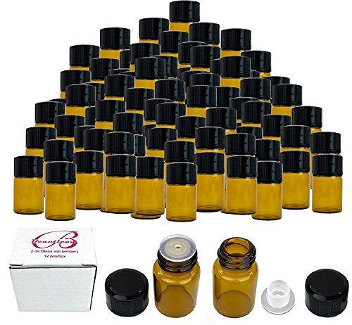 60 Pack Beauticom 2ML (5/8 Dram) Amber Glass Vial for Massage Oils, Fragrances, Serums, Mixes and Other Liquids with Orifice Reducer and Dropper Top