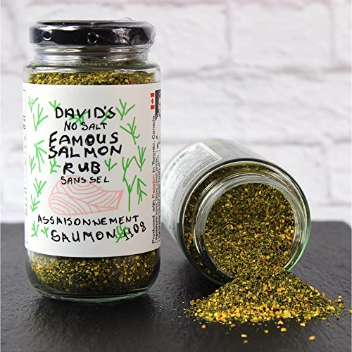 -. Binding : Misc. -. Brand : David's -. EAN : 0066958187187 -. Feature : 1 x 110 g jar (3.9 oz) / A heart-healthy salt-free herb and spice blend that's perfect for salmon, fish or any seafood / A bright fresh blend of herbs and seasonings like fresh dill and lemon peel / Perfect with salmon, or any fish, roasted or grilled. Use to flavour cream or butter sauces for fish / Produced in Canada using only the highest quality herbs and spices sourced from around the world -. IsAdultProduct : 0 -. Label : Qualikitchen Inc. -. Manufacturer : Qualikitchen Inc. -. PackageQuantity : 1 -. ProductGroup : Grocery -. ProductTypeName : GROCERY -. Publisher : Qualikitchen Inc. -. Studio : Qualikitchen Inc. -. Title : David's Famous Salmon Seasoning Rub - 110g -. UPC : 066958187187