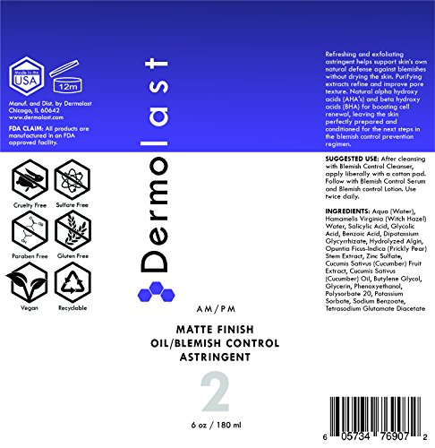 ≈ QUALITY IN ABUNDANCE ≈ Don’t settle for less! Dermolast™ prides itself on being industry leaders when it comes to improving on the old norms of Matte Finish Oil / Blemish Control Astringent formulation. We use humanely sourced Lilac Stem Cells, Salicylic Acid, Glycol Acid and Grapefruit Peel Oil. Dermolast™ Matte Finish Oil / Blemish Control Astringent has the sharpest premium formulation on the market.