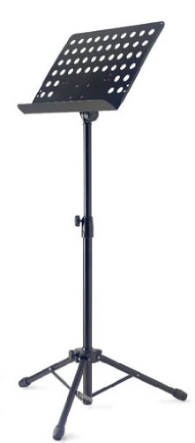 -. Feature : Standard orchestral music stand with metal sheet rest and punched holes; sturdy and durable / Steel construction, with tubular stand and folding legs / Cast-iron leg housing / Metal connector clamps; adjustable height with locking screw / Height adjustable 28.7" - 49.6"