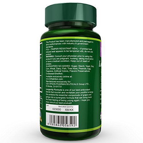 -. Feature : SELF-TESTED EXPERT FORMULA - Longevity Formula contains three major ingredients: Ginkgo Biloba, Resveratrol, Grape Seed Extract; each of them bring different benefits to our brain functions, cardiovascular and immune system. A healthy brain, and heart function plus strong immune system promote longevity / THE U.S. QUALITY - FDA-Inspected Facility - we manage our own state-of-the-art manufacture and supervise EVERY details in the process to make sure we are GMP-compliant. We have successfully maintained FDA registration for more than 7 years without any problems. / PURITY - With 100% natural, ginkgo biloba extract(with 24%ginkgo flavonol glycosides and 6% ginkgo terpene lactones), standardized to 50% polygonum cuspidatum root extract, 95% grape seed extract, we find you the purest possible ingredients in the market. / 2 Months Supply with MONEY-BACK GUARANTEE - 3 capsules per serving, total 120 Capsules for Maximum Strength and Potency - DON'T feel the effect of resveratrol? NO PROBLEM! We offer 2 MONTHS money-back guarantee. If you can't feel the quality or you doubt the quality after purchase, just leave us an honest and unbiased comment, and we will refund immediately! Your opinion will always help us to improve every detail in our services! / VEGGIE CAPSULES PLUS FILLERS BINERS FREE - Vegan-friendly formula brings you more benefits than normal formula. We replace useless fillers-binders powder with 24 kinds of fruit and vegetable powders to maximize its potency.