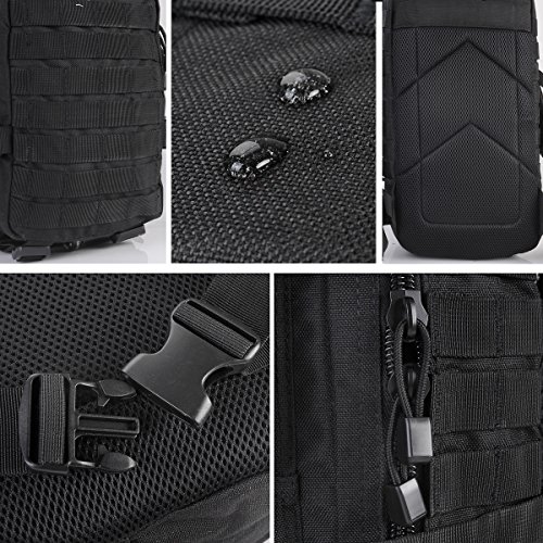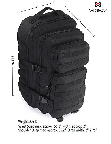 -. Feature : ★50L CAPACITIES: WIDEWAY tactical gear, approx. 11"*18.5"*13" (W*H*D), provides enough room in the 4 compartments with outer pouch, zipper pockets, internal dividers and ventilated padded back panel reaching 50L, very popular for extra large capacity and also water resistant sturdy expandable spacious. / ★3 ADJUSTABLE STRAPS: WIDEWAY tactical hydration pack, fully adjustable compression shoulder strap, sternum strap and waist strap with mesh padding, aids in comfort expansion and consolidation. / ★MOLLE WEBBING: WIDEWAY tactical molle backpacking works for attaching additional pouches or storing extra outdoor gear such as sleeping bag, water bottles, work boots, camera, tablet, laptop and other odds and ends, making it the excellent pack for a bugout or 3 day assault pack. / ★JUST FOR YOU: WIDEWAY tactical range backpack is suitable for complex environment, a variety of different outfits and casual styles such as school, outdoor, running, hiking, camping, hunting, cycling, traveling, climbing and so on, good choice for men and women. / ★MANUFACTURER GUARANTEE: WIDEWAY military tactical backpack, from a SGS, ISO and ITS certificated manuafacturer with much brand experience, provides 30-days no risk 100% full refund assurance if you dislike and 1 year warranty.