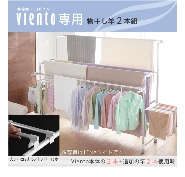 ●商品について:追加用のアルミ伸縮物干し竿(2本組)です。アルミ伸縮物干しスタンドに竿を追加していただくと布団等の立体干しをしていただけるようになります。干した時に空間ができるので通気性が良くなります。