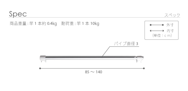●サイズ(cm):長さ85~140cm・直径3cm・重量約0.4kg/本、耐荷重約10kg/本