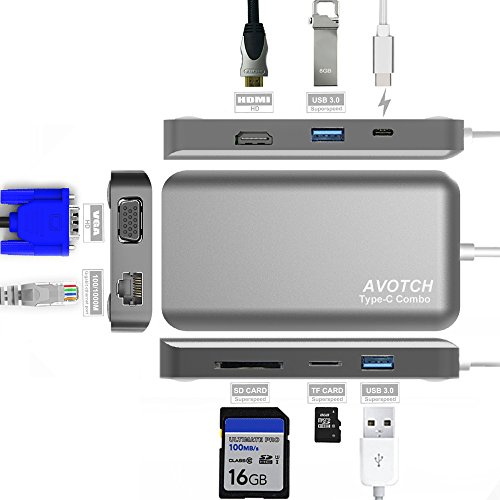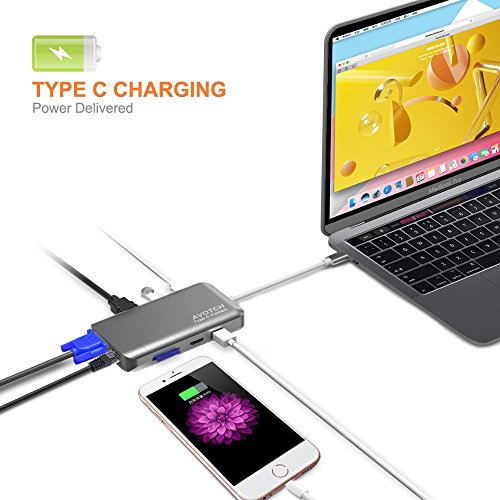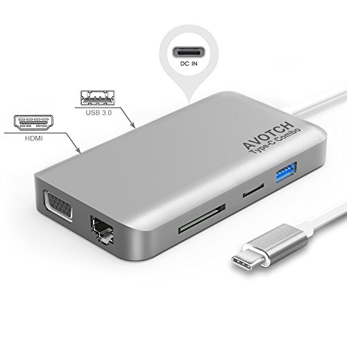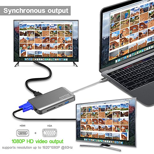 USB-C Digital AV Multi-port Adapter, AVOTCH USB C Hub ,3.1 Type C Hub , HDMI VGA Dual screen display Output, Card Reader, 2 USB 3.0 Ports and Gigabit Ethernet Adapter- Grey