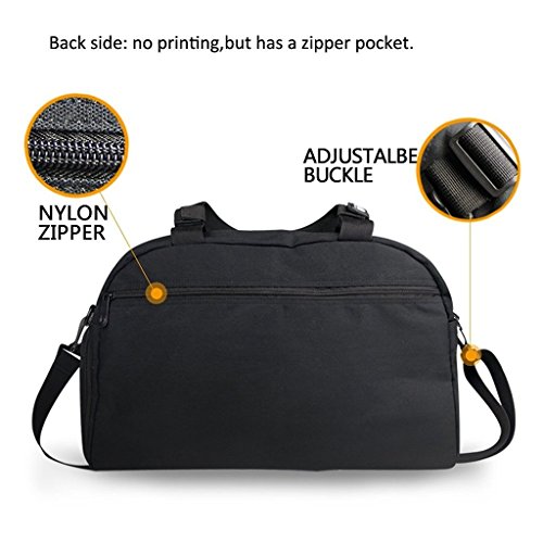 -. Feature : Approx Dimensions:17.7" L x 11.4" H x 8.2" W / Zippers on main compartment,adjustable strap and carry handls / Material:canvas,durable, stain resistant and no peculiar smell / Pockets:1 side zipper pocket for shoes;1 pocket on the back;3 interior pockets(convenient to store clothes,water bottle,cell phone,etc) / Easy to take away,perfect weekend bag,suitable for travel and sports