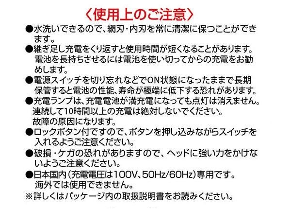 | 仕様 | 充電式 電源:100V 50/60Hz 充電時間:約5時間 連続使用:30分(フル充電) コード長(ACアダプター):約175cm 水洗い可能 保証期間:3ヶ月 |