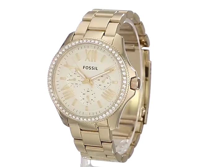 An ultraglamorous design for the ultimate chic sophisticate, this sparkling Fossil® timepiece will add just the right amount of shimmer to any elegant ensemble! Stainless steel case. Rose gold-tone or gold-tone bracelet features a fold-over clasp closure with push-button release. Round face. Three-hand analog display with quartz movement. Dial features rose gold-tone or gold-tone hour markers, Fossil branding, and three sub-dials. Crystal-embellished bezel. Water resistant 10 ATM/100m. Imported. Measurements: Case Height: 40 mm Case Width: 40 mm Case Depth: 11 mm Band Width: 3⁄4 in Band Circumference/Length: 9 in Weight: 5 oz This product may have a manufacturer's warranty. Please visit the manufacturer's website or contact us at warranty@support.zappos.com for full manufacturer warranty details.Feature