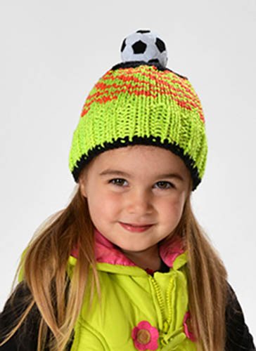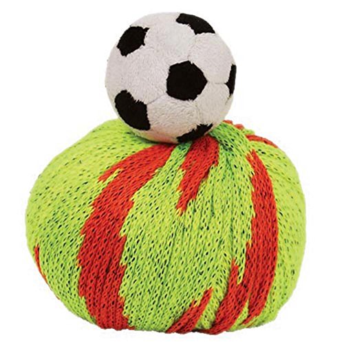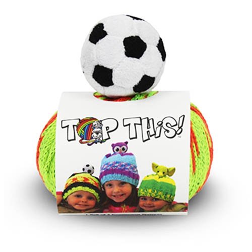 80G ball of multi-colored, multi-textured yarn, colorful plush soccer ball topper, soft stabilizing grommet, and knitting instructions to make a hat for toddlers to teens.