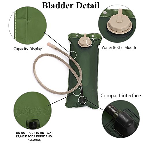 -. Feature : HIGH QUALITY:Material of backpack is 600D encryption Oxford waterproof fabric;Bladder Water Bag is made of nylon. High quality materials to prevent leakage. / HIGH-CAPACITY:Except the pocket for bladder,there is a extra pocket for your belongings.Just like keys,cards,mobile phones and the other objects. / LIGHTWEIGHT AND LABOR SAVING: This bag is small,light and durable about a pound. The wide straps is very labor-saving. A great backpack for men, women and kid to stay hydrated. / SPORTS PARTNER:Great partner of running, hiking, Riding and other Outdoor sport.Free your hands and concentrate more on exercise. / EASY TO CARRY: Besides the shoulder straps, there are two handles.The backpack straps are designed with 6 round buttons for placing glasses, hats, and other objects.
