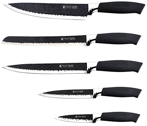 - STRONG STAINLESS STEEL AND BLACK KNIFE SET: High-quality, stainless steel blades feature an embossed non-stick coating to prevent food from sticking. Strong yet lightweight black handles give each embossed knife proper weight and balance.