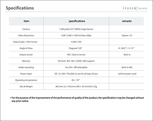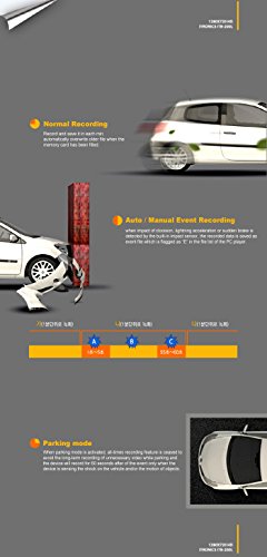 -. Feature : HD (1280 x 720) Continuous Recording / Battery Discharging Protection / High Luminance Security LED / Auto Parking Mode (Impact + Motion Detection) / Audio Recording - On/Off Button