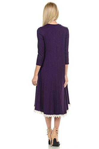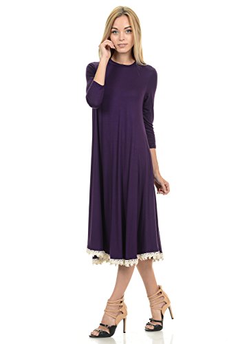 This dress features 3/4 sleeves, crew neckline, midi lenght and crochet lace trim at the bottom. It is made with a soft jersey knit that will create a beautigul drape.