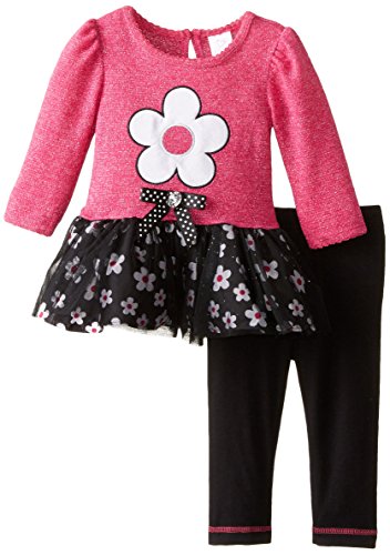 -. Feature : 2 Piece set, dress & legging / Flower applique on bodice with tack on bow detail / Mesh over daisy print skirt / Black legging / Bodice: 84% Polyester/4% Spandex/12% Metal, Skirt: 100% Polyester, Legging: 57% Cotton/38% Polyester/5% Spandex