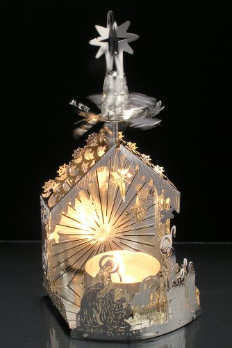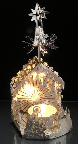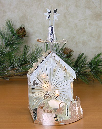 Nativity Scene Candle Holder with Spinning Stars - Laser Cut Plated Silver - Scandinavian Design