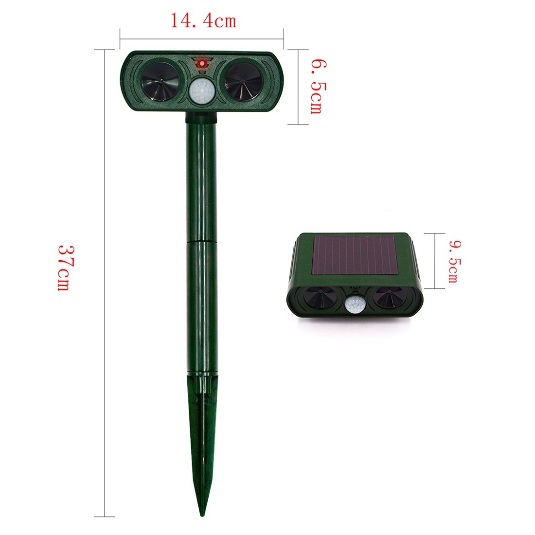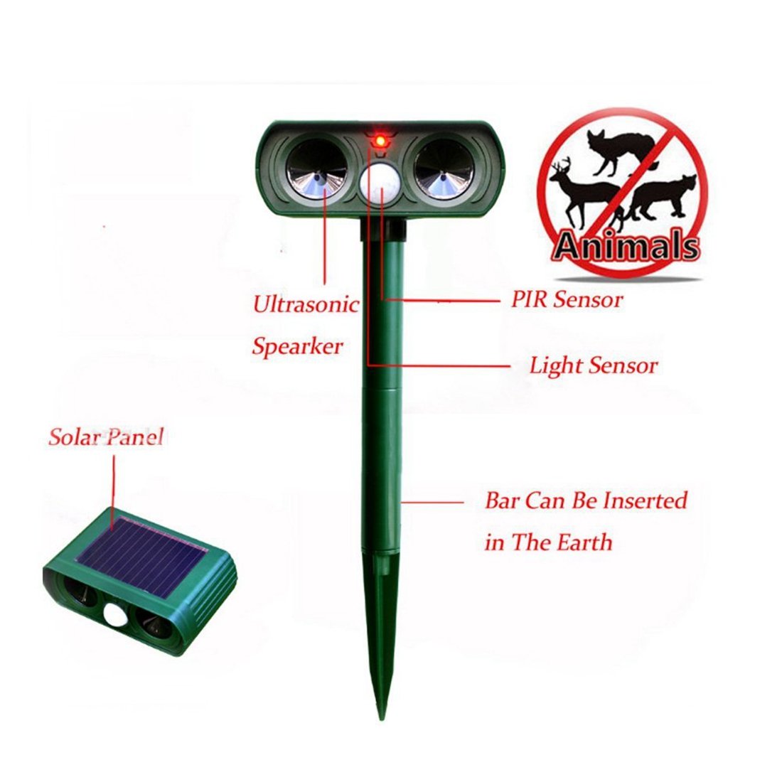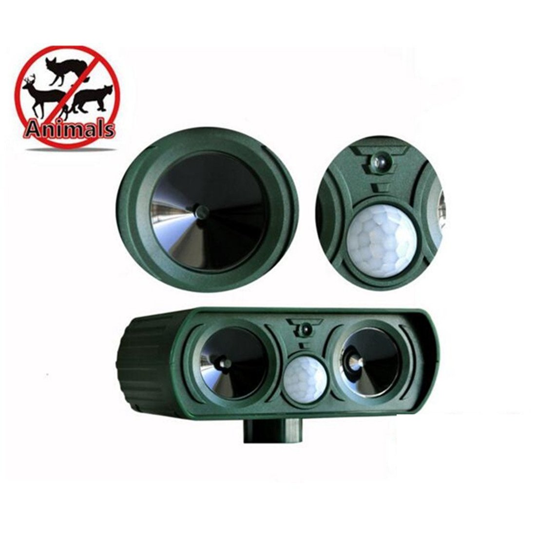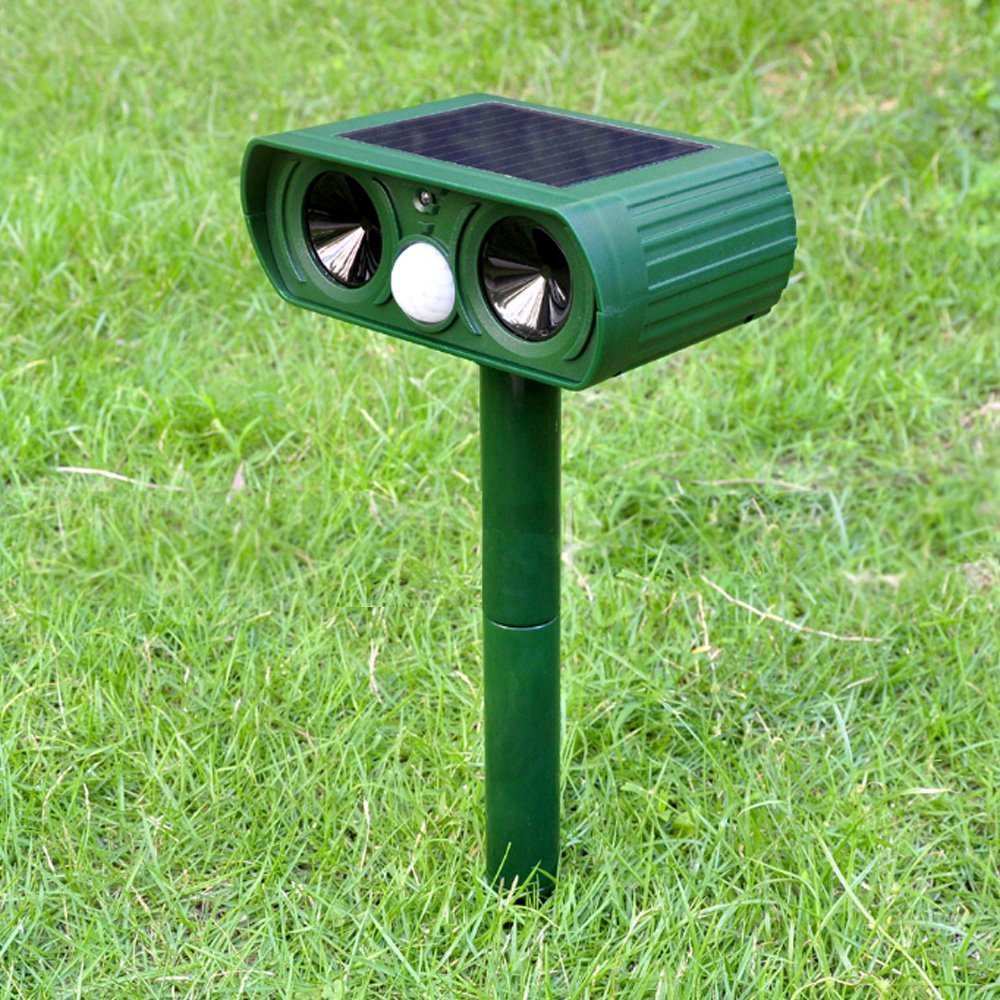 By releasing ultrasonic waves of high frequency and strong flash, it will drive away animals (such as cats, dogs, rats, foxes, birds, rodents, etc.) without hurting them, it is harmless to humans and the environment because it is a hard ultrasonic wave for people