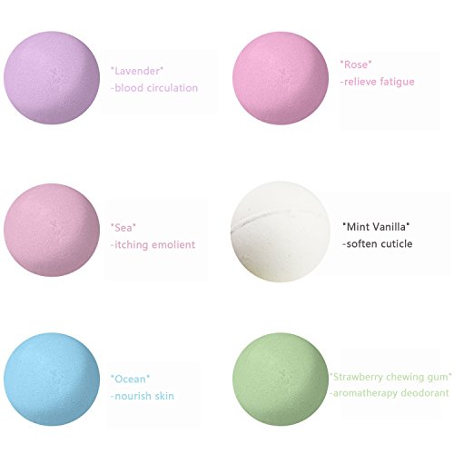 - 6PCS/SET BATH BOMB KIT - Includes 6 Different Flavor, And Different Functions: "Lavender", Relieve Fatigue, "Strawberry Chewing Gum", Aromatherapy Deodorant, "Rose",Relieve Fatigue, "Mint Vanilla", Soften Cuticle, "Ocean", Nourish Skin, "Sea" , Itching Emollient .