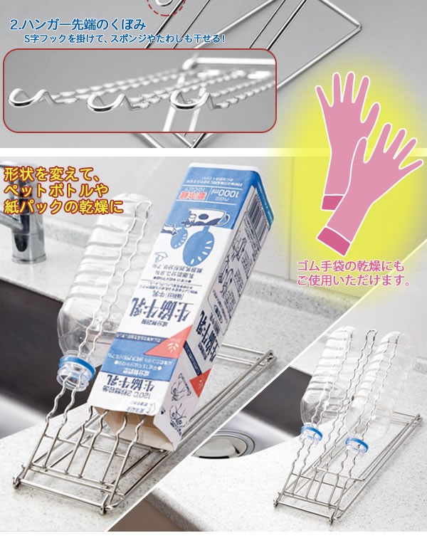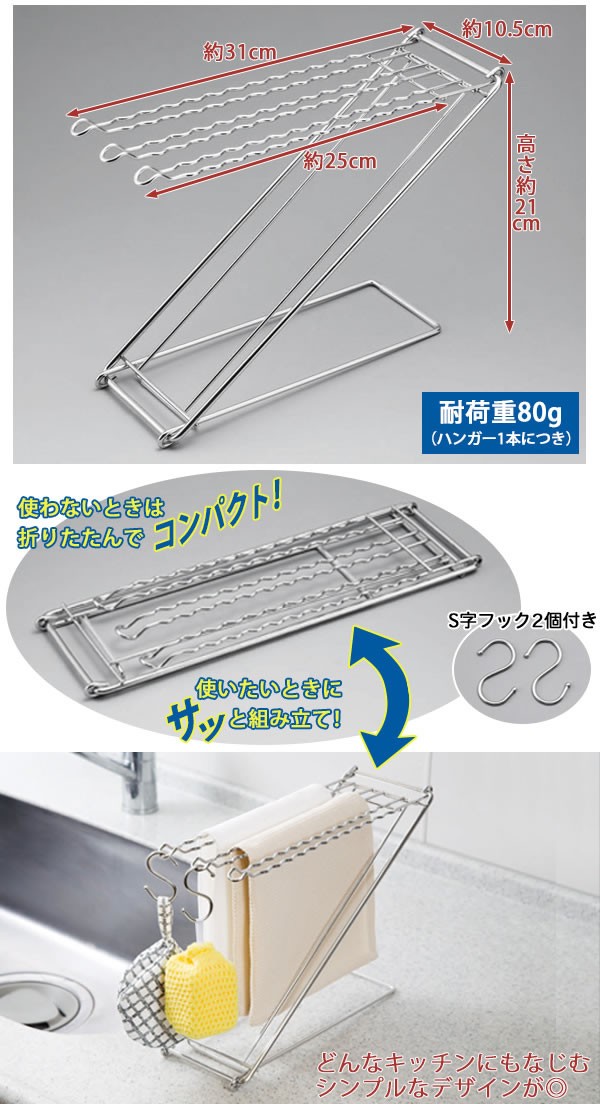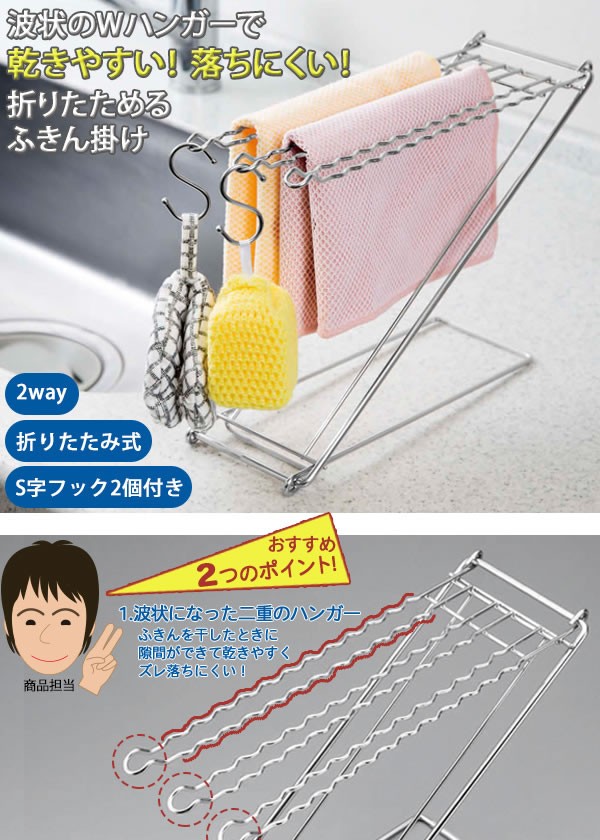 | <h1>波状になった二重ハンガーで、ふきんが乾きやすくてズレ落ちにくい!折りたためるふきん掛けです。先端のくぼみにはS字フックを掛けてスポンジも干せます。形状を変えて、ペットボトルや牛乳パックの乾燥もできます。使わない時は折りたたんでコンパクト、使いたい時にサッと組み立てられます。S字フック2個付き/ふきん掛け/布巾ハンガー/フキン干し/布巾スタンド/ステンレス/キッチングッズ/フック付</h1> |