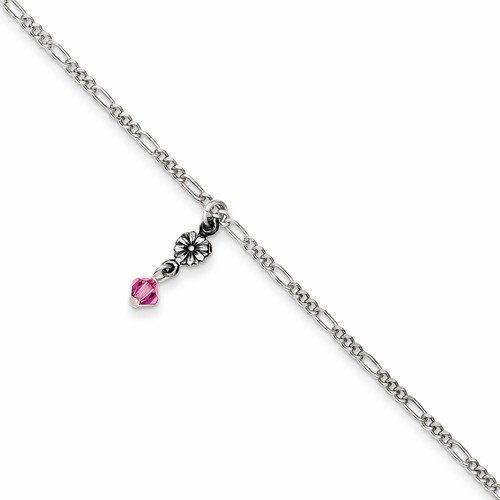 Solid 925 Sterling Silver 9inch Polished Antiqued Pink Crystal Beaded Bracelet Anklet 9"