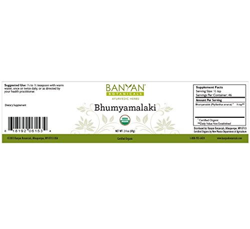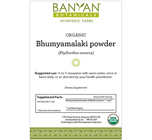 -. Binding : Health and Beauty -. Brand : Banyan Botanicals -. Feature : Supports proper function of the liver* / Cleanses the gall bladder* / Promotes healthy skin* / Cools and soothes the digestive tract* -. IsAdultProduct : 0 -. Label : Banyan Botanicals -. LegalDisclaimer : These statements have not been evaluated by the Food and Drug Administration. This product is not intended to diagnose, treat, cure, or prevent any disease -. Manufacturer : Banyan Botanicals -. MPN : 6150 -. PartNumber : 6150 -. ProductGroup : Health and Beauty -. ProductTypeName : HEALTH_PERSONAL_CARE -. Publisher : Banyan Botanicals -. Studio : Banyan Botanicals -. Title : Banyan Botanicals Bhumyamalaki Powder - Certified Organic, Phyllanthus amarus - Detoxifies and strengthens the liver*