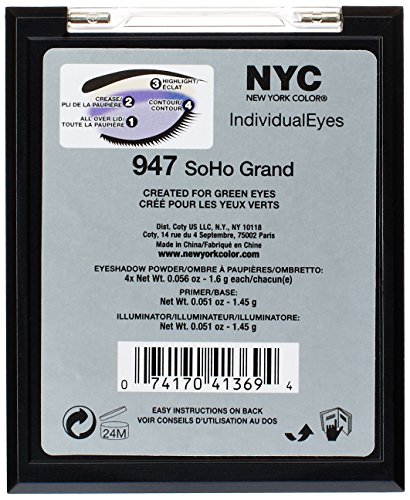 -. Binding : Health and Beauty -. Brand : N.Y.C. -. Color : SoHo Grand -. EAN : 0074170413694 -. Feature : Discover NYC New York Color individual eyes custom compact, the all-in-one compact with everything you need for a complete eye look, P.R.Imer, illuminator, applicator and complementing shadows / With four colors, specially coordinated to intensify and enhance your eye color, you can create a look as individual as you are / Make your eyes pop -. IsAdultProduct : 0 -. Label : Coty Beauty Hazmat -. Manufacturer : Coty Beauty Hazmat -. Model : 27322105947 -. MPN : NY947 -. NumberOfItems : 1 -. PackageQuantity : 1 -. PartNumber : NY947 -. ProductGroup : Beauty -. ProductTypeName : BEAUTY -. PublicationDate : 2014-05-17 -. Publisher : Coty Beauty Hazmat -. ReleaseDate : 2014-01-01 -. Size : .158 OZ -. Studio : Coty Beauty Hazmat -. Title : N.Y.C. New York Color Individual Eyes, SoHo Grand, 0.158 Ounce -. UPC : 074170413694