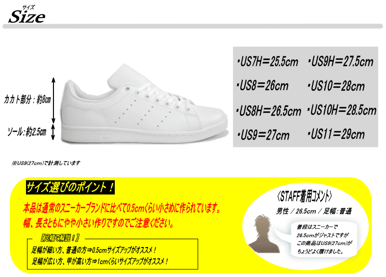 | サイズ | 作り⇒やや小さめ(横幅細め) 【サイズ選びのポイント!】 足幅が細い方、普通の方⇒0.5cmくらいサイズアップがオススメ! 足幅が広い方、甲が高い方⇒1.0cmくらいサイズアップがオススメ! |