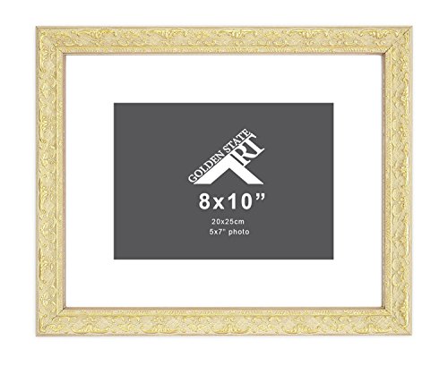 Golden State Art, 8x10 Frame for 5x7 Photo with White Mat, Table-Top Easel Stand, & Real Glass (Golden-Beige Ornate Finish)