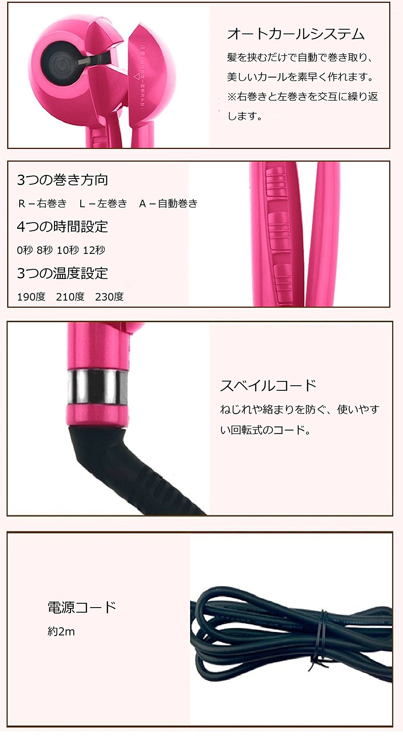 Miracar is innovative technology called ceramic autocal chamber, it takes care of wrapping the hair without troublesome hair just by pinching the hair in the body of the Miracar, it is automatically wound up, so you can make the curls as you want.
