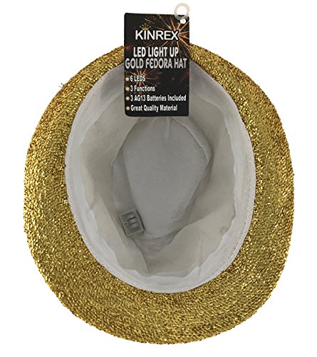-. Brand : KINREX -. Color : Gold -. Department : Unisex -. EAN : 0854389006470 -. Feature : Say Hello to the New Year wearing this great quality KINREX LED Gold Party Fedora Hat -. ProductGroup : Apparel -. ProductTypeName : ADULT_COSTUME -. Size : One Size -. Title : KINREX LED Light Up Gold Fedora Hat - Party Hats -Happy New Year Hat -. UPC : 854389006470