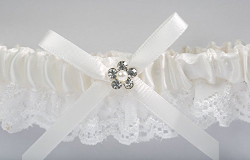 Ivory colored Satin Bow embellished with a rhinestone with a short Lace Garter.