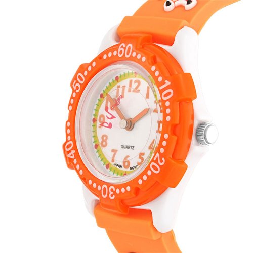 Help your little one to always be on time with the gift of this adorable kids puppy paw prints watch. Show some real puppy love and fetch this orange puppy watch for any boy or girl in your life who is ready to learn the task of how to tell time. If your little one loves dogs, this orange puppy dog watch is a great gift. Our analog orange animal watch makes learning to tell time easy. The cool puppy watch features a rotation bezel and a photo dial along with hour, minute and second hands to help him or her along the way. The rubber strap of the orange kids animal watch is packed with a cool and brightly colored design of black and white puppies wearing red and scattered paw prints on the background. The orange rubber strap is made of smooth, soft rubber and will prove very comfortable on his or her wrist. Since the orange rubber band adjusts from 5 inches to 7 inches, this fun animal watch can also grow along with your child. The 3D pvc strap is quite durable. Our orange rubber watch boasts palladium nickel plating on the case, a Japanese movement and a stainless steel back for a long lasting life. Order this cute puppy watch today and start him or her on a lifetime of learning.Feature