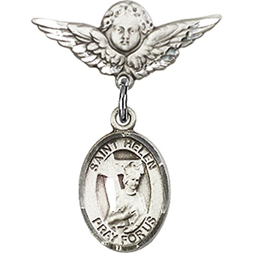 -. Title : Sterling Silver Baby Badge with St. Helen Charm and Angel w/Wings Badge Pin 7/8 X 3/4 inches
