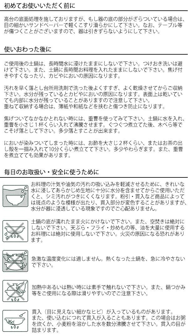 ごはん鍋はごはんをおいしく炊く為に作られた土鍋です。通常の土鍋より胴が肉厚で、熱伝導がよく沸騰後も温度が下がりにくいので、お米が対流しやすく美味しいごはんが炊けます。白いごはんはもちろん玄米やおかゆ、炊き込みごはんまでおいしく仕上げます。 |