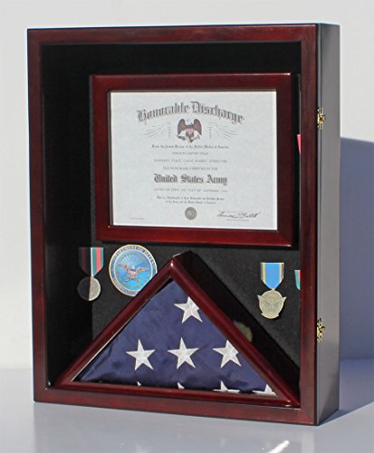 - Crafted from solid wood. Dimensions: 21.75"H X 17.5"W X 4.25"D (Outside) , Interior Depth: 3.5, Interior of the triangle for the 3'X5' flag folded: 14"W X 7"H X 2.25"D, Interior of the certificate frame 8.5"H X 11" W.