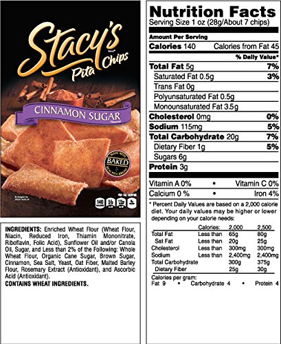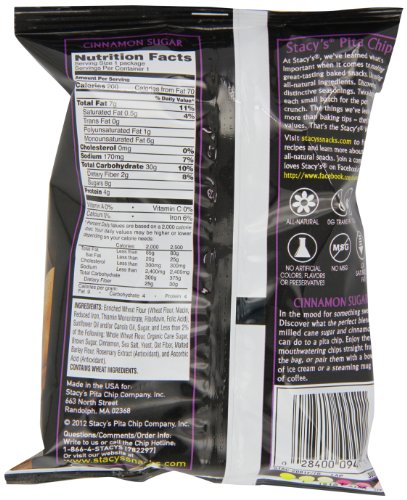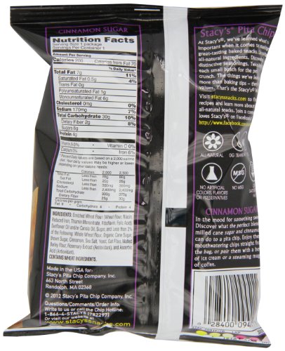 -. Feature : 24 count case of 1.5-ounce bags of Stacy's Cinnamon Sugar Pita Chips / Pure cinnamon and milled cane sugar come together on real twice-baked pita bread for a delicious crunch / Baked, no artificial colors or flavors, made with all non-GMO ingredients, and no MSG / Enjoy these portion friendly Stacy's Cinnamon Sugar Pita Chips on the go, as a delightful lunch companion, or anytime / Delicious paired with a bowl of ice cream, a steaming cup of coffee or tea, or a fresh fruit salsa