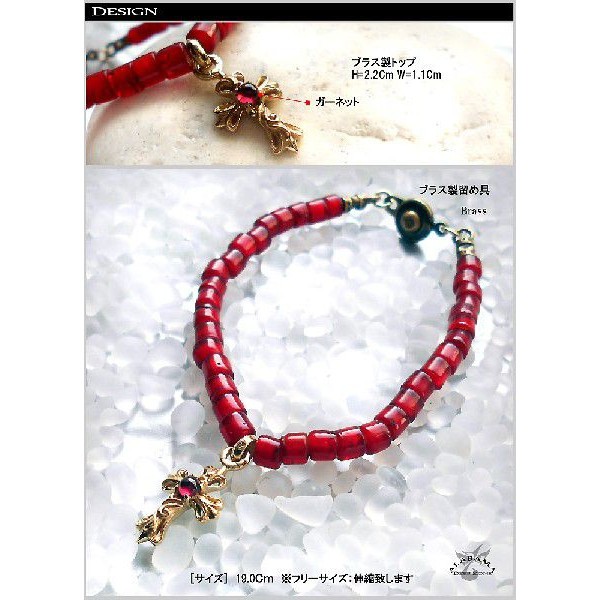 イタリアベネチア産のアンティークビーズを使用したブレスレット。◆アンティークビーズとは?1900年代初頭までに作られたビーズ。形や色が不揃いといったあじわいがあります。色落ちや色あせが起きにくいという特徴を持ちます。クロスモチーフトップのセンターにガーネットが1石埋め込まれています。トップと留め具はブラス製(真鍮)【素材】アンティークビーズ(ブレスレット部)ブラス製(真鍮)・ガーネット(トップ)ブラス製(真鍮)(Tバー留め具)【カラー】レッド【サイズ】19cm(フリーサイズ・伸縮します)※エラスティックゴムで結束していますので、留め具をしたまま装着脱着が出来ます。
