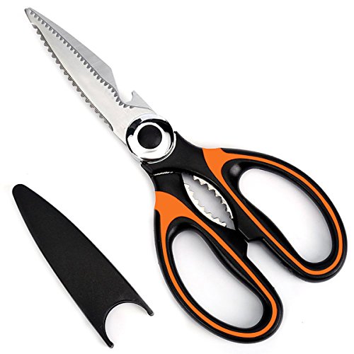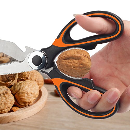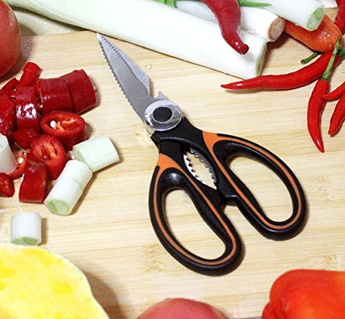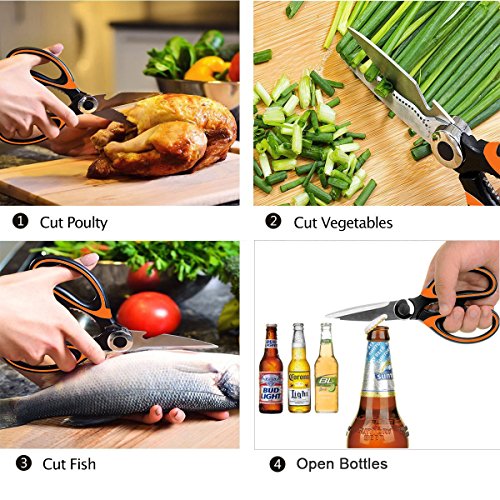 - FUNCTIONAL DESIGN: Ultra sharp kitchen shears, heavy duty cutting rib bones scissors for exact cuts with less effort. Serrated section of the shears in easy grip handle for opening tough sealed bottles and cracking nuts! Simple and smooth design enables easy to clean.