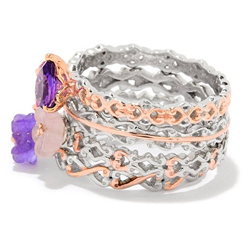 -. Binding : Jewelry -. Brand : Michael Valitutti -. Department : womens -. Feature : Set of 4 stackable rings / One each of pearshaped African Amethyst (6x4mm) 0.32ct, flower shaped Amethyst Quartz and Rose Quartz (6mm), and oval Pink Topaz (6x4mm) 0.57ct. / Total Band Width: 7-8mm / Two Tone & High polish / Measurements: 3/16"L x 3/4"W x 3/16"H -. Label : Nathan Hennick and Company -. Manufacturer : Nathan Hennick and Company -. ProductGroup : Jewelry -. ProductTypeName : FASHIONRING -. Publisher : Nathan Hennick and Company -. Studio : Nathan Hennick and Company -. Title : Michael Valitutti Palladium Silver Set of Four Multi Gemstone Carved Flower Stack Band Rings